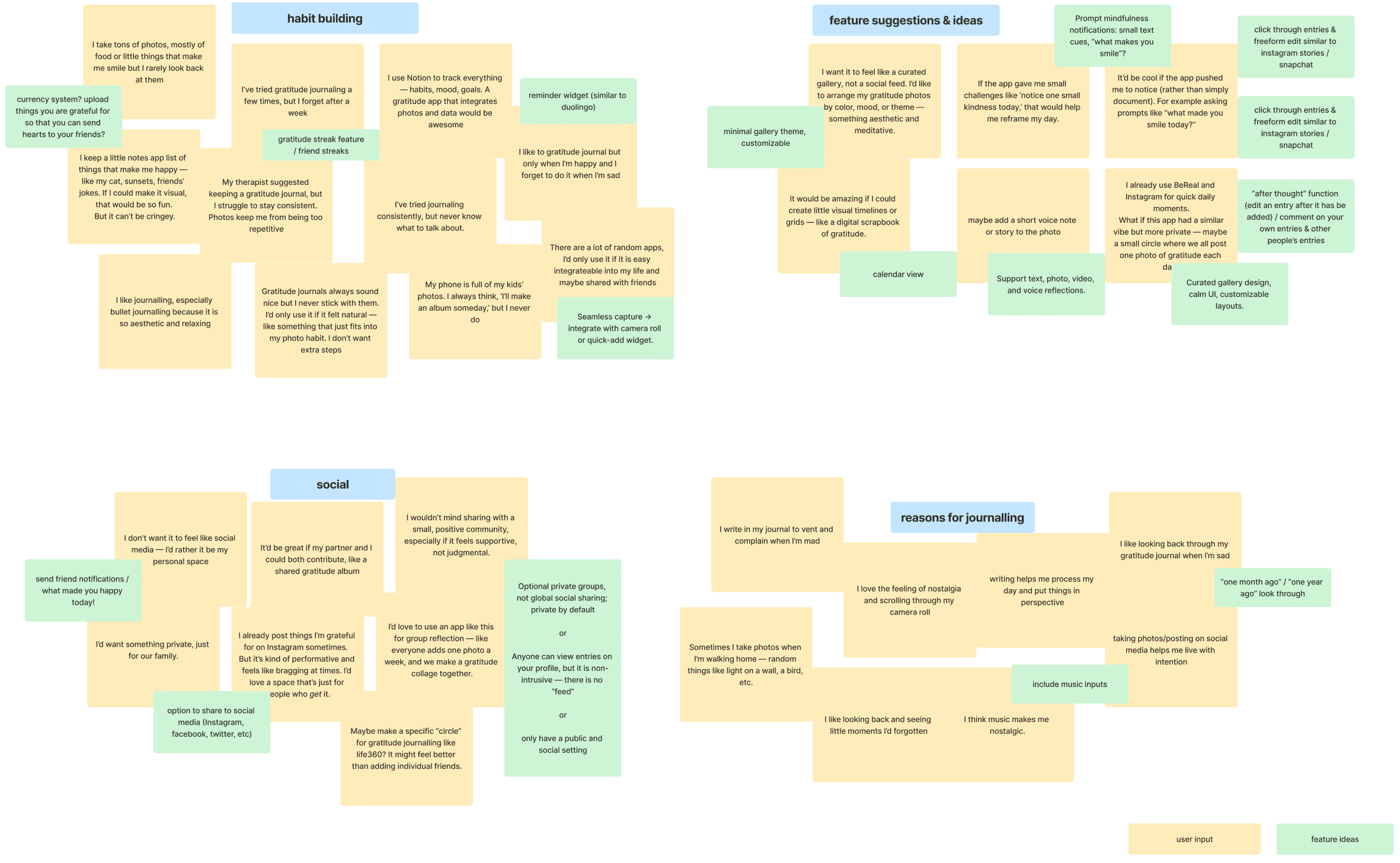 Gratitude journalling has been found a highly effective method to improve mental health and mindset. The next step was to see if there is a demand for a gratitude journalling app. I conducted 20+ user surveys and had an extensive conversation with 10+ people to see what they thought. I synthesized my findings through an affinity map.