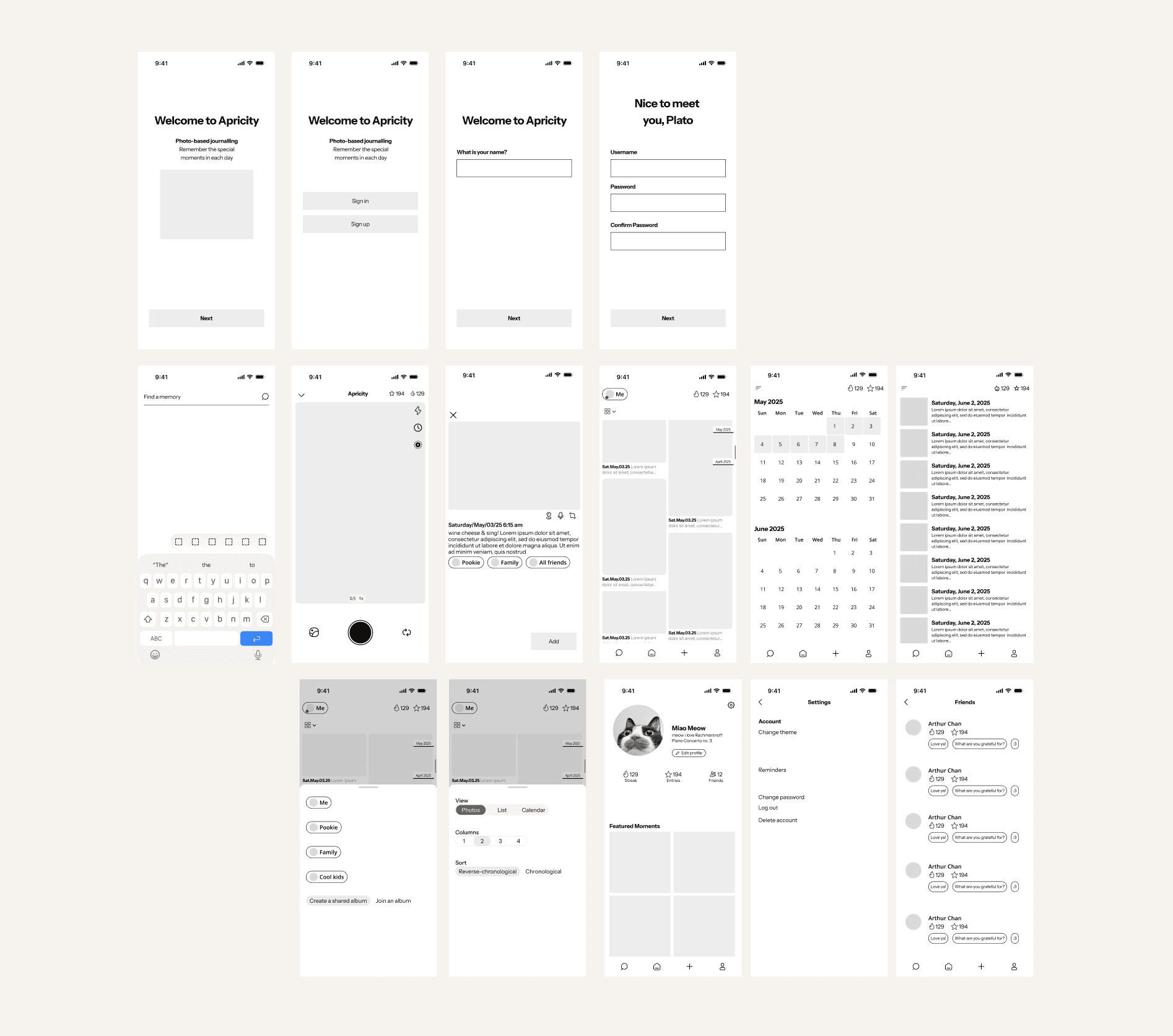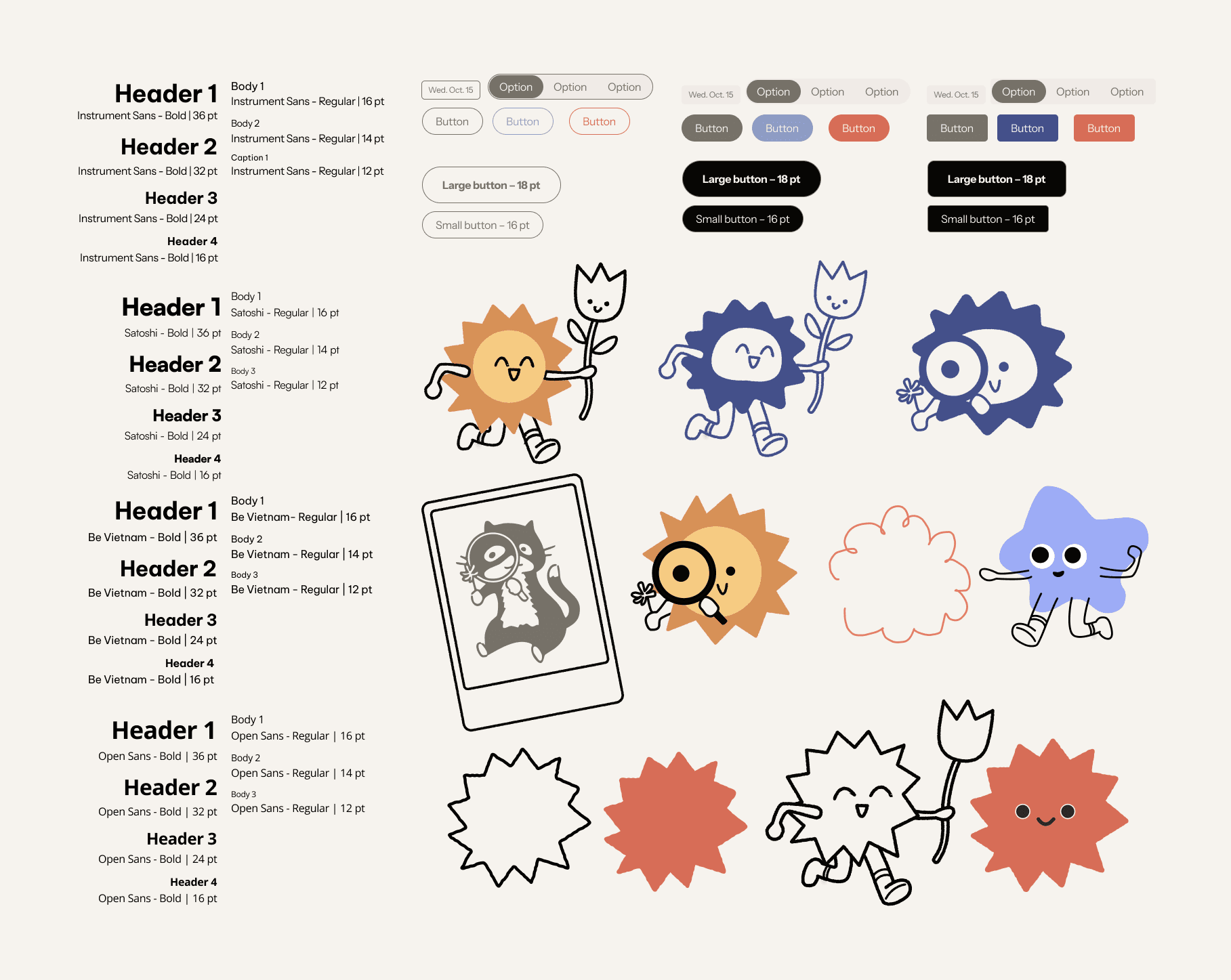After A LOT of mood boarding, and light hearted sketches, I arrived at the final branding & visual component system below! The graphics I created are only used in the initial sign up process since I felt the app itself should be more minimal and act as a neutral archive.