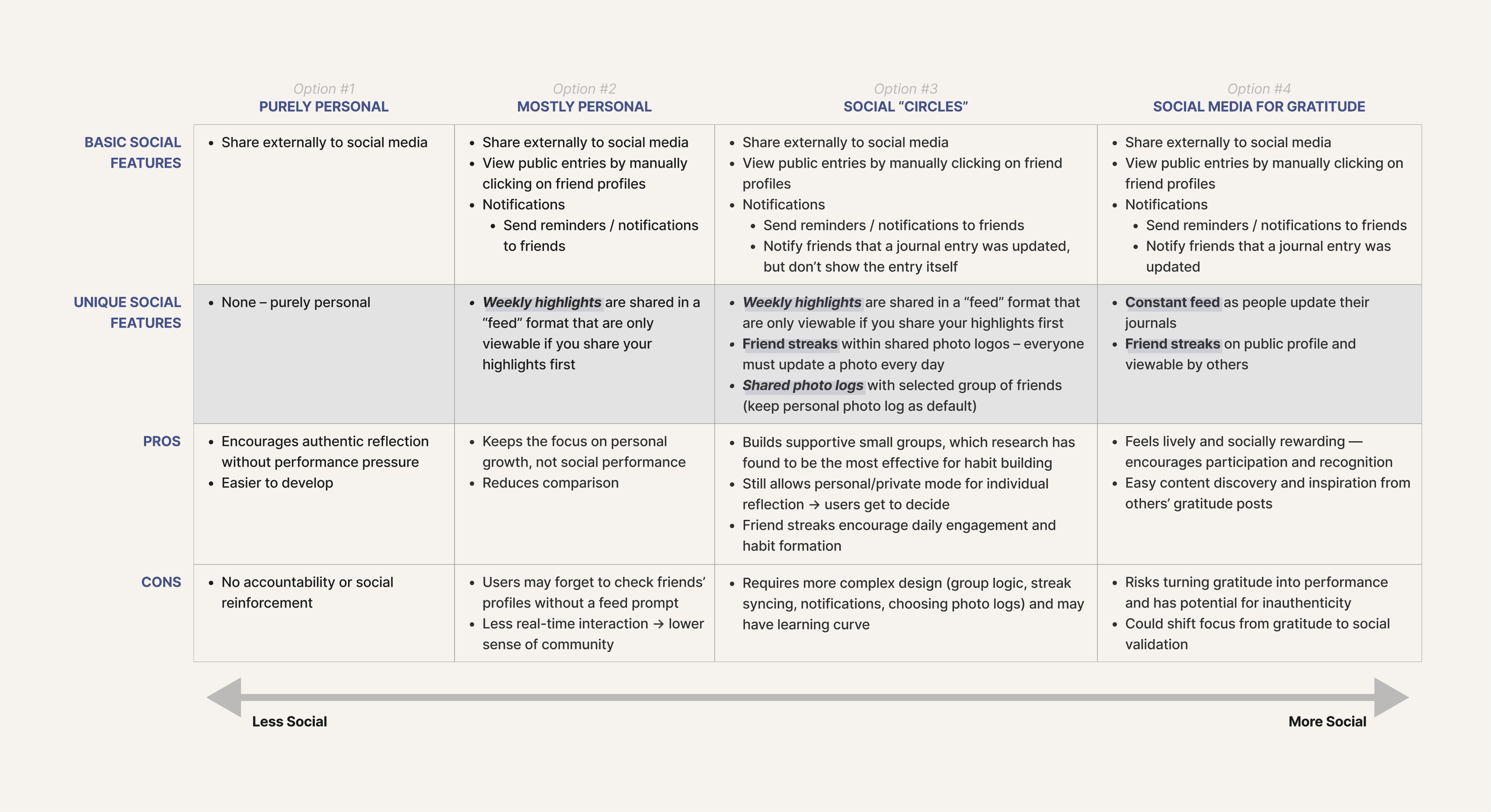 An accountability partner has been found to be highly effective in maintaining commitment, however, I wanted to ensure that the app remains authentic. I listed different app options with varying social levels and went with option 3 – "Social Circles".