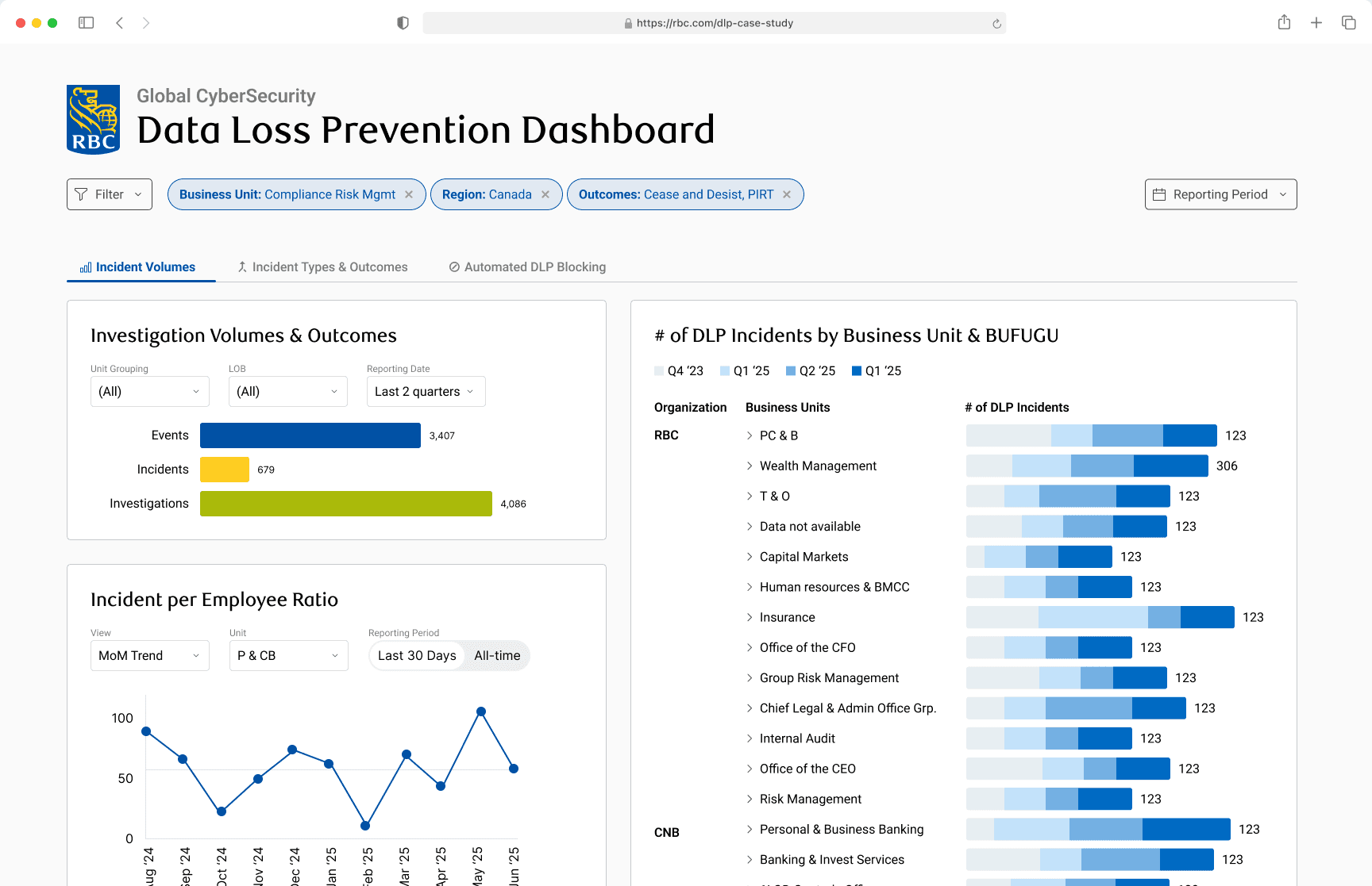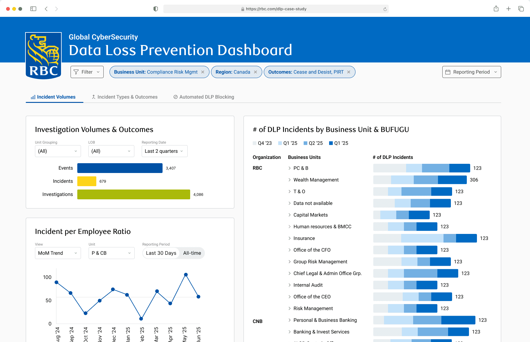 I joined RBC as a Design Engineer Intern on the Data Loss Prevention (DLP) team where I was tasked with redesigning the DLP dashboard.