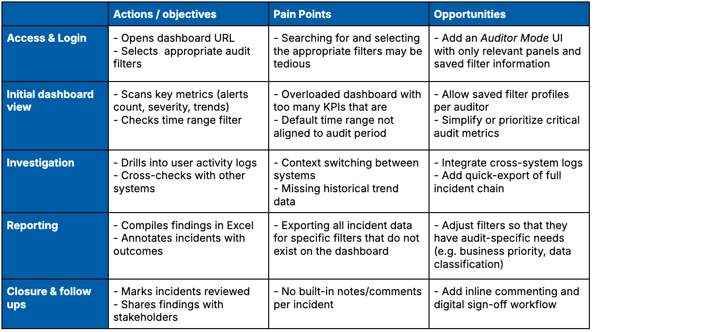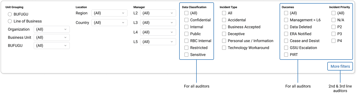 I spoke with first, second, and third line auditors to identify the additional filters that should be added, sorting requirements between "must-have", "nice-to-have", and "bonus".