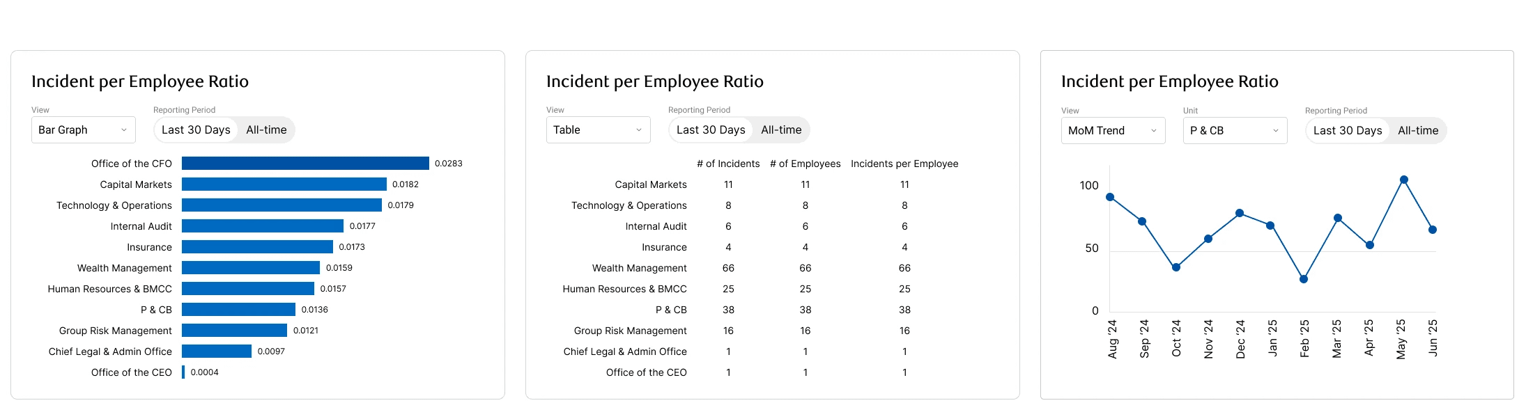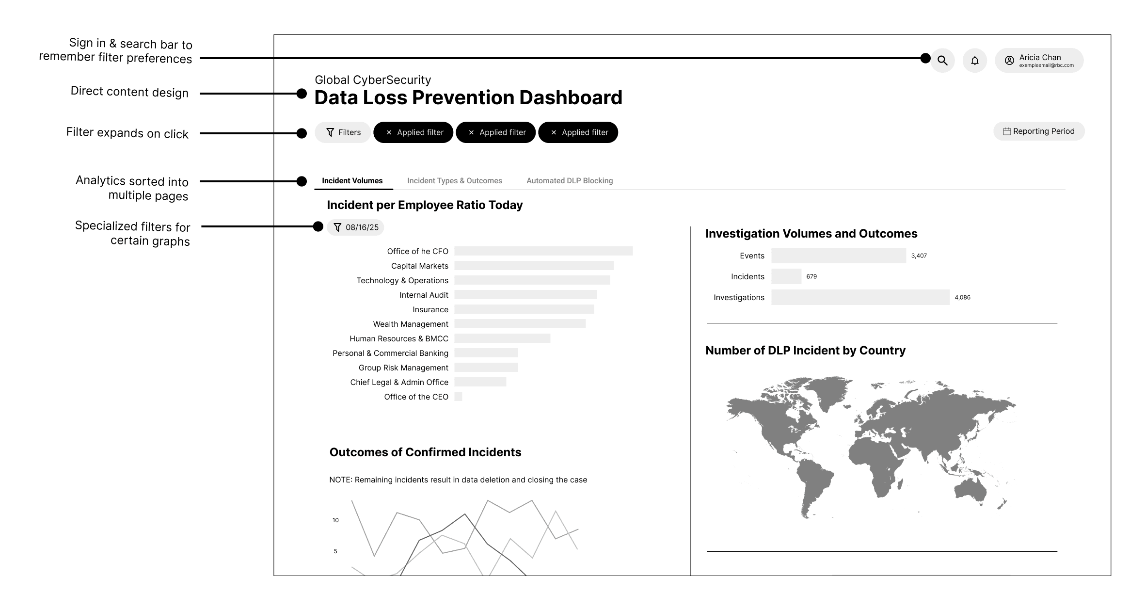 I asked users which graphs they look at the most, and had them tell me why they used those graphs. From their responses, I was able to categorize the data into three main pages: incident volumes, incident types and outcomes, and automated blocked events.