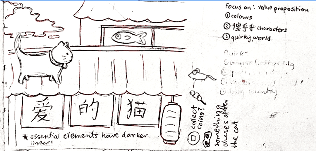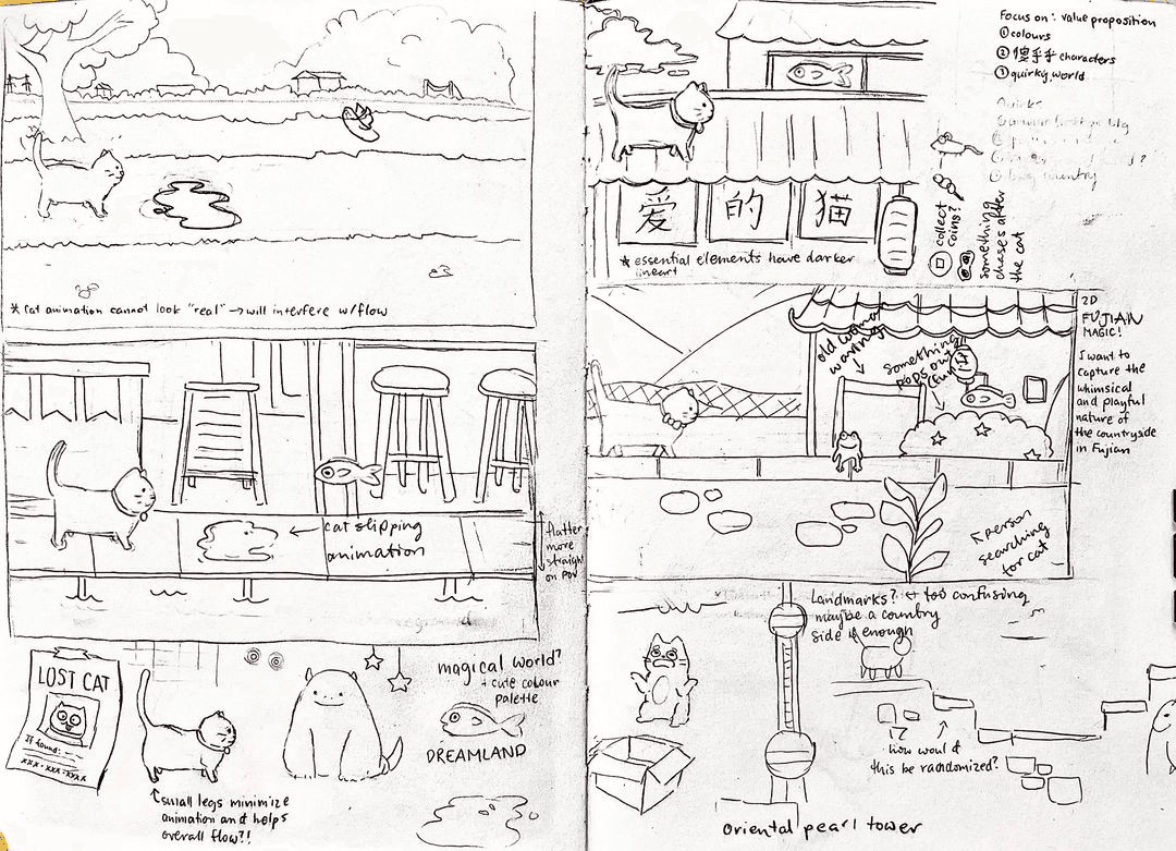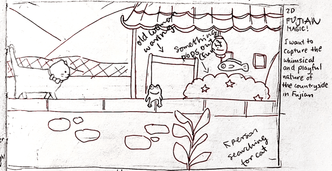 One of my concept sketches depicted the cat on the rooftops of Chinese shops. While it was a cute idea, I felt the perspective was too close to the cat, limiting the view of the broader environment.