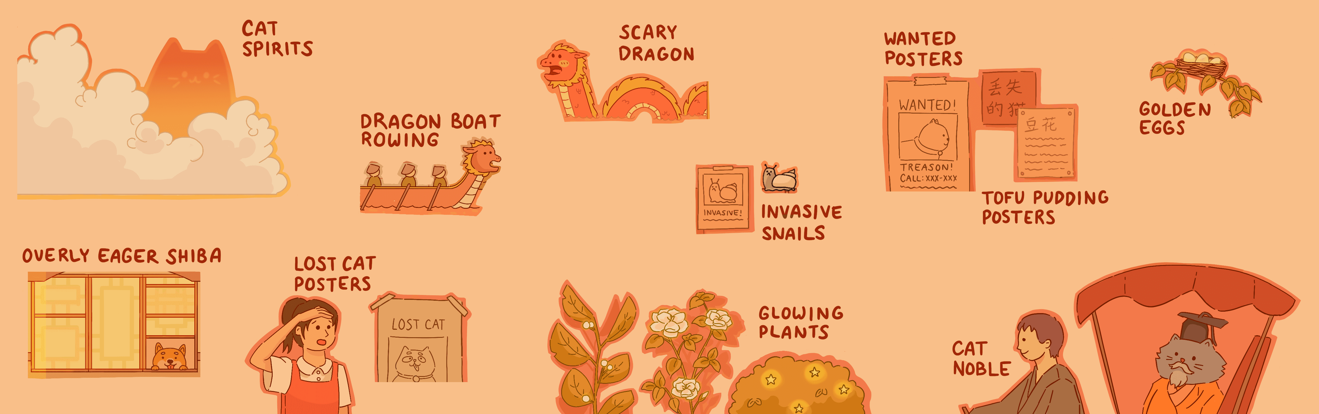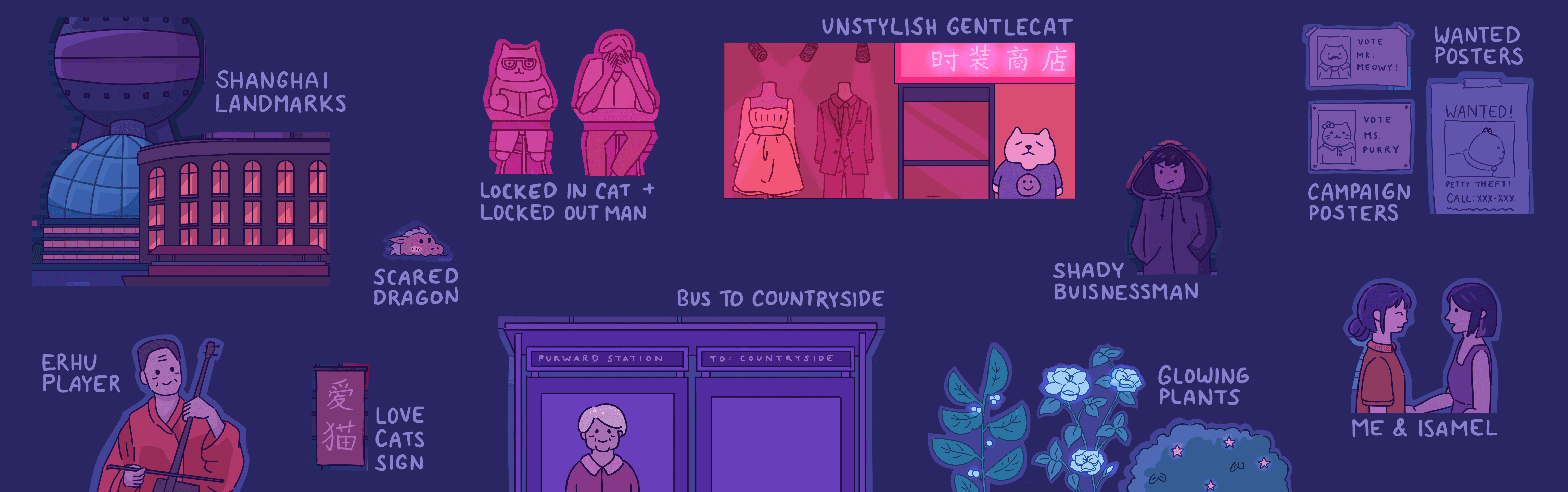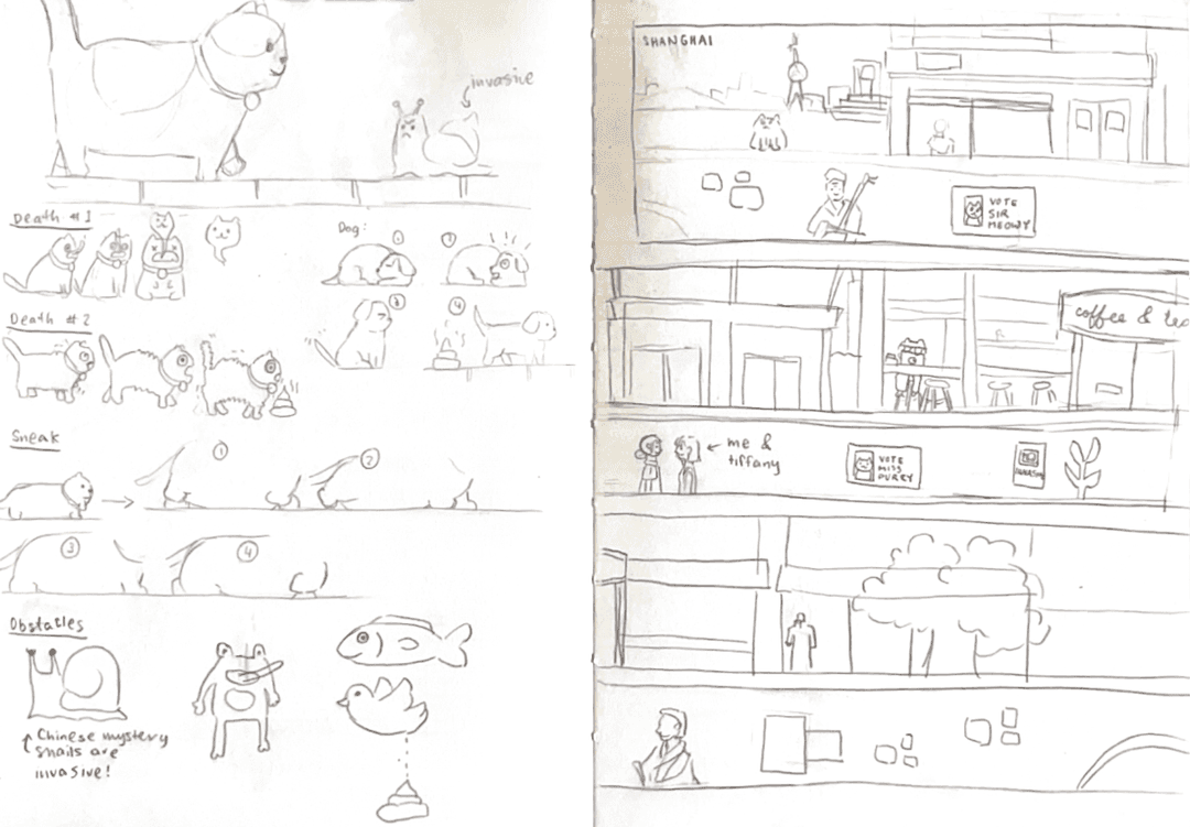 The “night” game map is inspired by my dad's home city, Shanghai. Keeping up with the playful nature of the countryside, I added a dragon hiding in the water, playful political posters to vote a cat politician into office, and a grandma who wants to go back to the countryside.
